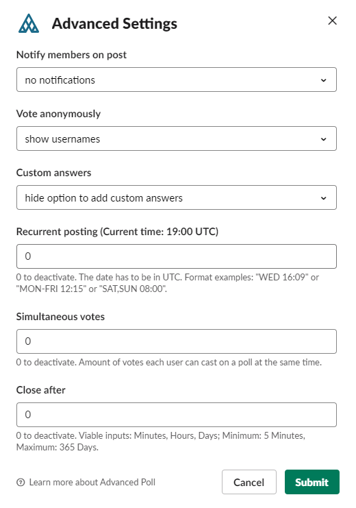 Close after gives you the option to automatically close a poll after a specific time. Closed polls can not be voted and the results of the poll will be displayed. Note: Decimal numbers are not supported. If you want to close a poll automatically after 1.5 hours then that needs to be entered as 90 minutes.