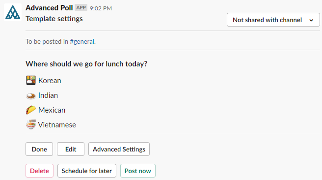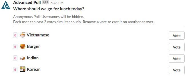 /apoll "Where should we go for lunch today?" "🍜 Vietnamese" "🍔 Burger" "🍛 Indian" "🍱 Korean" anonymous limit 2